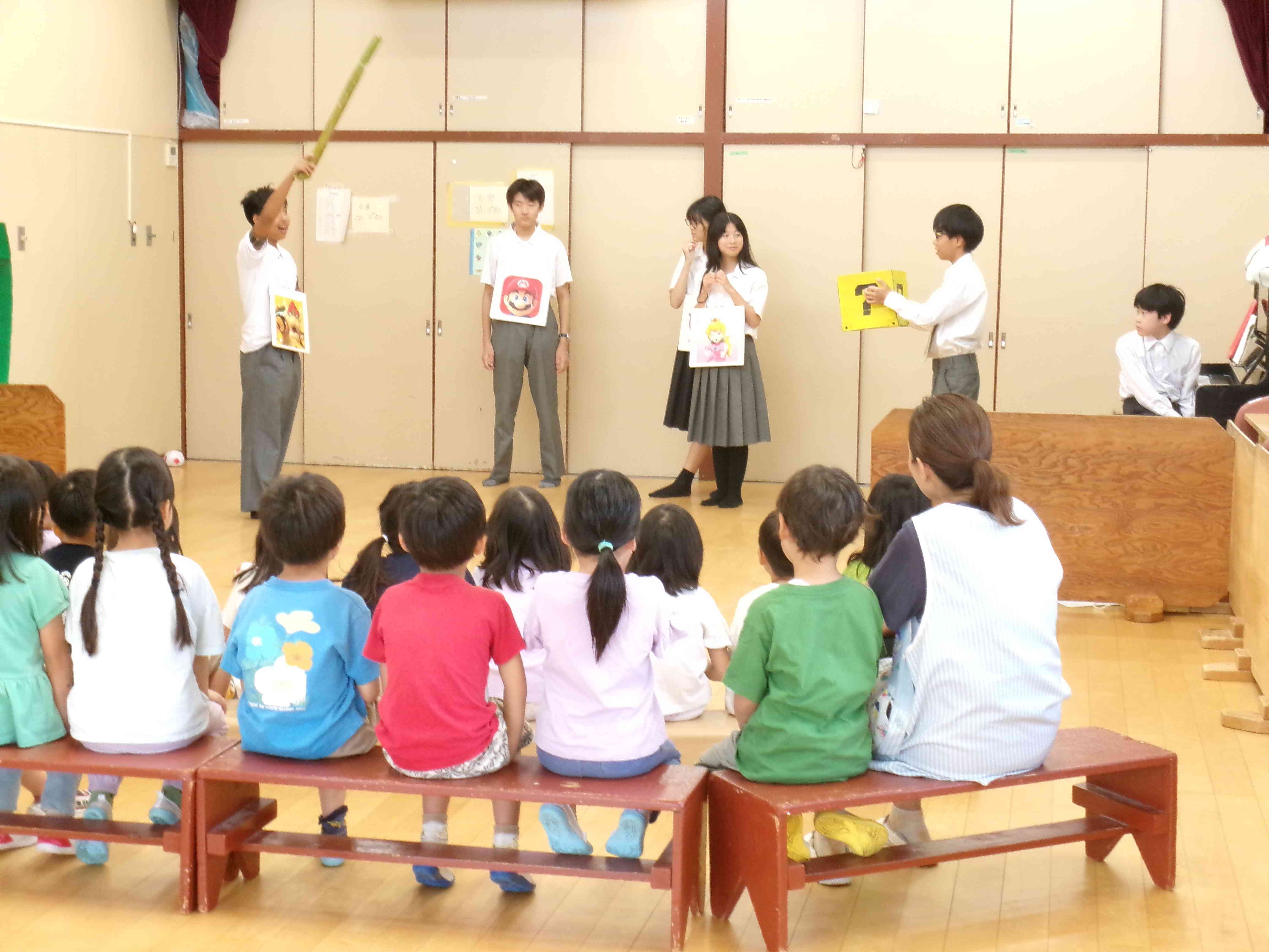9月30日(火)、槻の木学級の生徒で活動している部活動「槻の木部」が練習してきた劇を市内の保育園に披露しに行きました。 劇は「スーパーマリオブラザーズ」。少し緊張もしましたが、日ごろの練習の成果を発揮できました。園児たちにはコミカルな動きやセリフが大ウケでした。